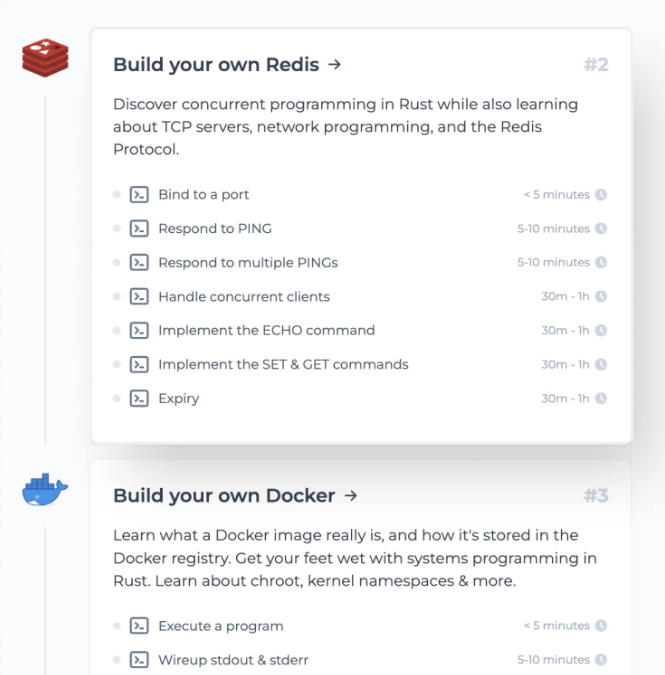 CodeCrafters lets you build tools like Redis, Docker, Git and more from the bare bones. With their hands-on courses, you not only gain an in-depth understanding of distributed systems and advanced system design concepts but can also compare your project with the community and then finally navigate the official source code to see how it’s done.