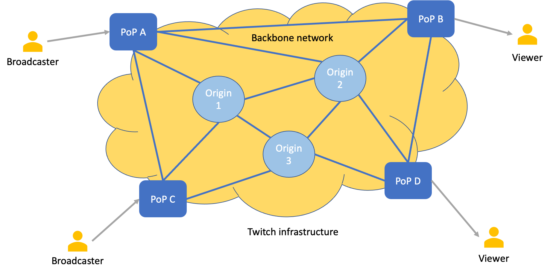 Viewers from around the world download the videos from PoPs. The intelligent network ensures the streamer’s channels are replicated across Twitch’s network in proximity to their viewers. Replicating all the channels across their network would be overkill.