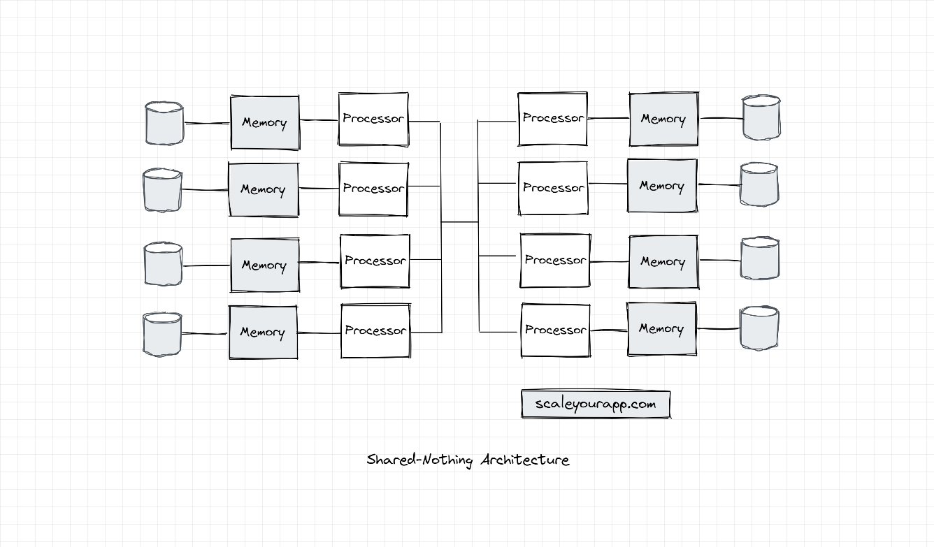 In contrast, the shared-nothing architecture focuses on horizontal scaling by adding more nodes to the cluster for independent parallel processing. However, in this scenario, the communication between the nodes in the cluster adds a bit of latency.