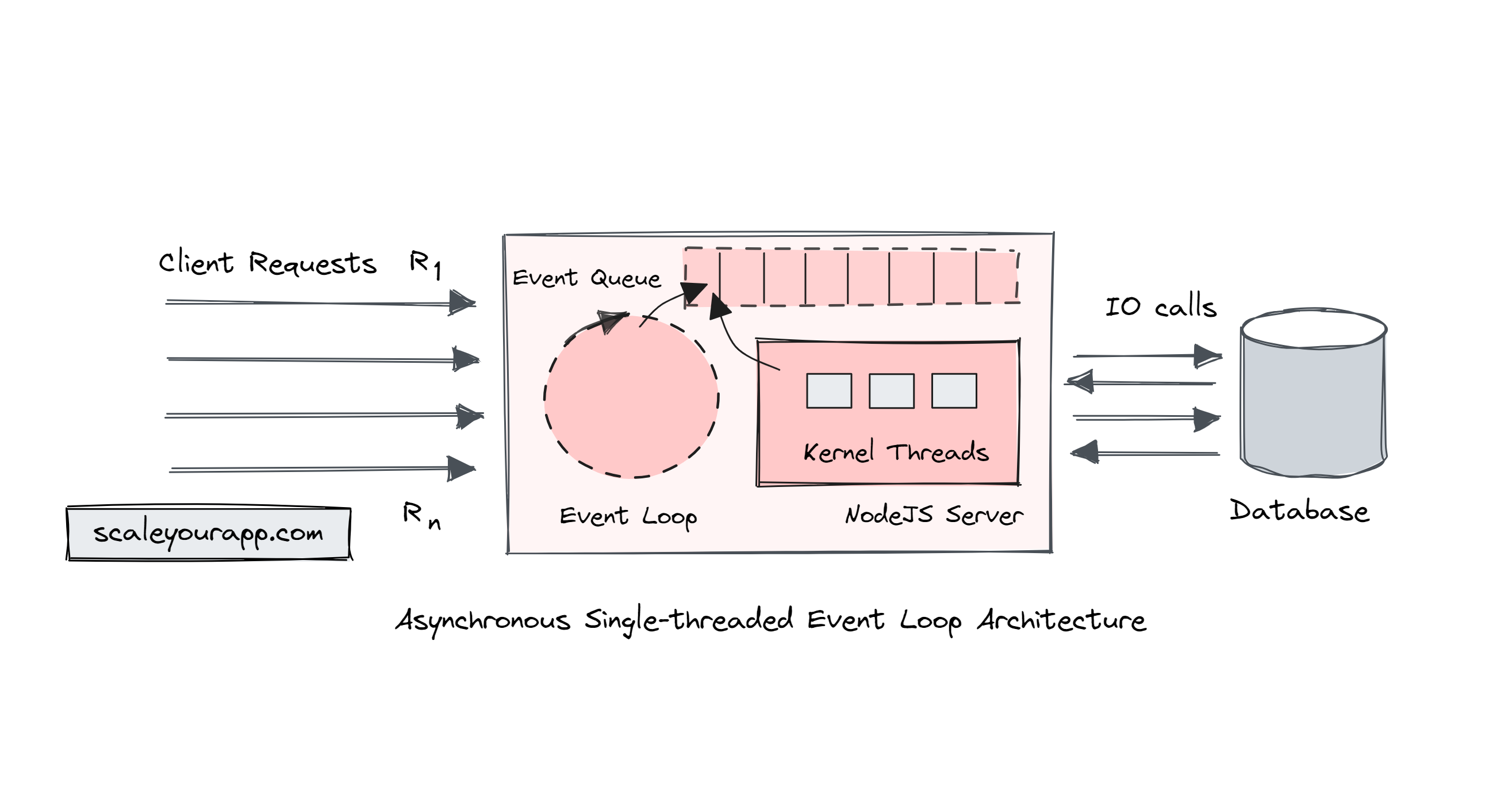 So, for instance, when a client sends an IO-bound request to the NodeJS server, an event is triggered and the event loop delegates the IO operation to the OS kernel, registering a callback in the event queue. The OS kernel maintains a pool of low-level threads that it leverages to complete the IO operation.