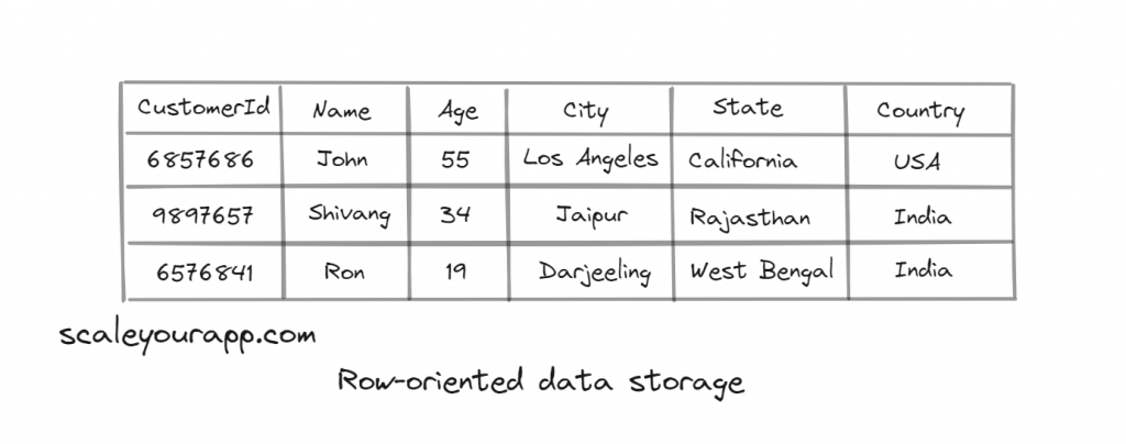 In this scenario, the customer ids will be stored on the disk at a certain location in one column, customer names in another column, customer city and country will be in respective columns and so on.